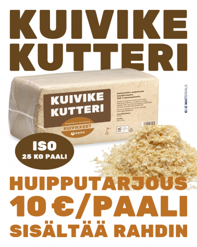 Isoon 25 kg paaliin pakattu Kuivikekutteri valmistetaan kotimaisesta, seulotusta kutterinlastusta. Riittoisa ja kilohinnaltaan edullinen kuivike on imukykyistä ja pehmeää ja soveltuu erinomaisesti käytettäväksi myös yhdessä turpeen kanssa.
