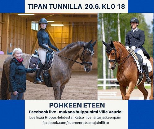 Tervetuloa mukaan seuraamaan Suomen Ratsastajainliiton Facebook-livelähetystä tänään maanantaina 20.6. klo 18: Pohkeen eteen Tipan tunnilla – mukana Ville Vaurio!