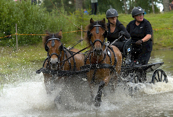 Poneissa kilpailevat sekä yksiköt että parivaljakot. Raisa Takkinen ja Kooihuster Harro on vetänyt jo hyvän eron Heidi Koskeen poneilla Suontolan Wäinö ja HS Choko, joka on 14,35 virhepistettä jäljessä. Mia Ventoniemi ja Lizalie Miris ja HS Luzille Miris.