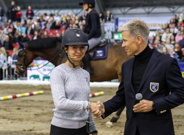 Mestariratsastajamerkin Anna-Julia Kontiolle luovutti Suomen Ratsastajainliiton puheenjohtaja Mikael Forstén. Hänellä on